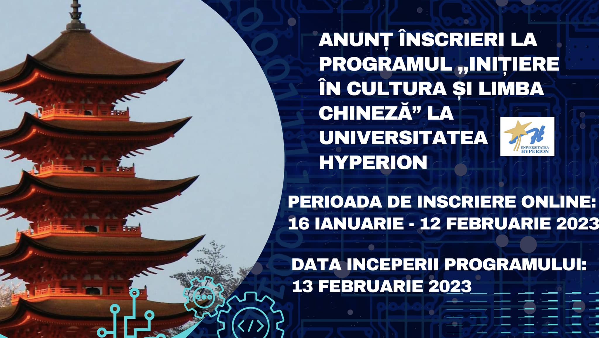 În perioada 16 ianuarie – 12 februarie 2023, Universitatea Hyperion din București – Facultatea de Științe Politice în parteneriat cu Centrul de Studii de Intelligence pentru Securitate și Geopolitică Aplicată – CSIS &GA, sub egida Centrului de Studii de Intelligence Hyperion, organizează înscrieri online pentru programul de formare intitulat ,,Inițiere în Cultura și Limba Chineză’’, care se va desfășura în sistem hibrid începând cu 13 februarie 2023.