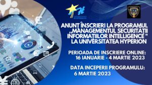 În perioada 16 ianuarie – 6 martie 2023, Universitatea Hyperion din București – Facultatea de Științe Politice în parteneriat cu Centrul de Studii de Intelligence pentru Securitate și Geopolitică Aplicată – CSIS &GA, sub egida Centrului de Studii de Intelligence Hyperion, organizează înscrieri online pentru  programul de formare intitulat ,,MANAGEMENTUL SECURITĂȚII INFORMAȚIILOR’’, care se va desfășura în sistem hibrid începând cu  6 martie 2023.