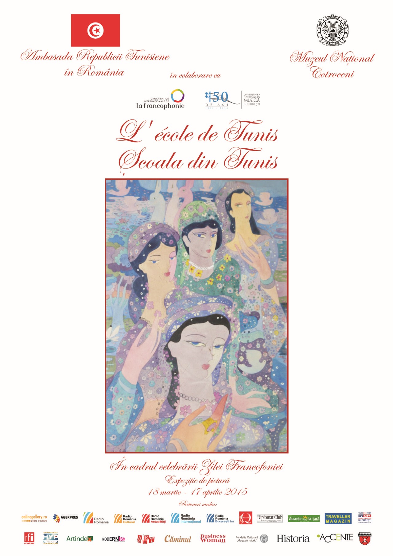 Muzeul Naţional Cotroceni în colaborare cu Ambasada Republicii Tunisiene la Bucureşti, organizează miercuri, 18 martie 2015, orele 18.30, în Salonul Cerchez al muzeului, vernisajul expoziţiei „L΄Ecole de Tunis / Şcoala din Tunis”. Expoziţia este organizată cu ocazia celebrării lunii Francofoniei de către GADIF (Grupul Ambasadelor, Delegatiilor, Instituţiilor Francophone).