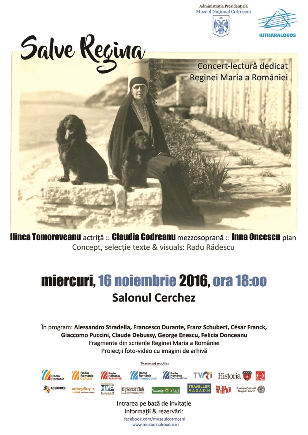 Muzeul Naţional Cotroceni, în colaborare cu Asociaţia Culturală Kitharalogos, organizează miercuri, 16 noiembrie 2016, orele 18.00, în Salonul Cerchez, concertul-lectură „Salve Regina” – dedicat Reginei Maria a României.