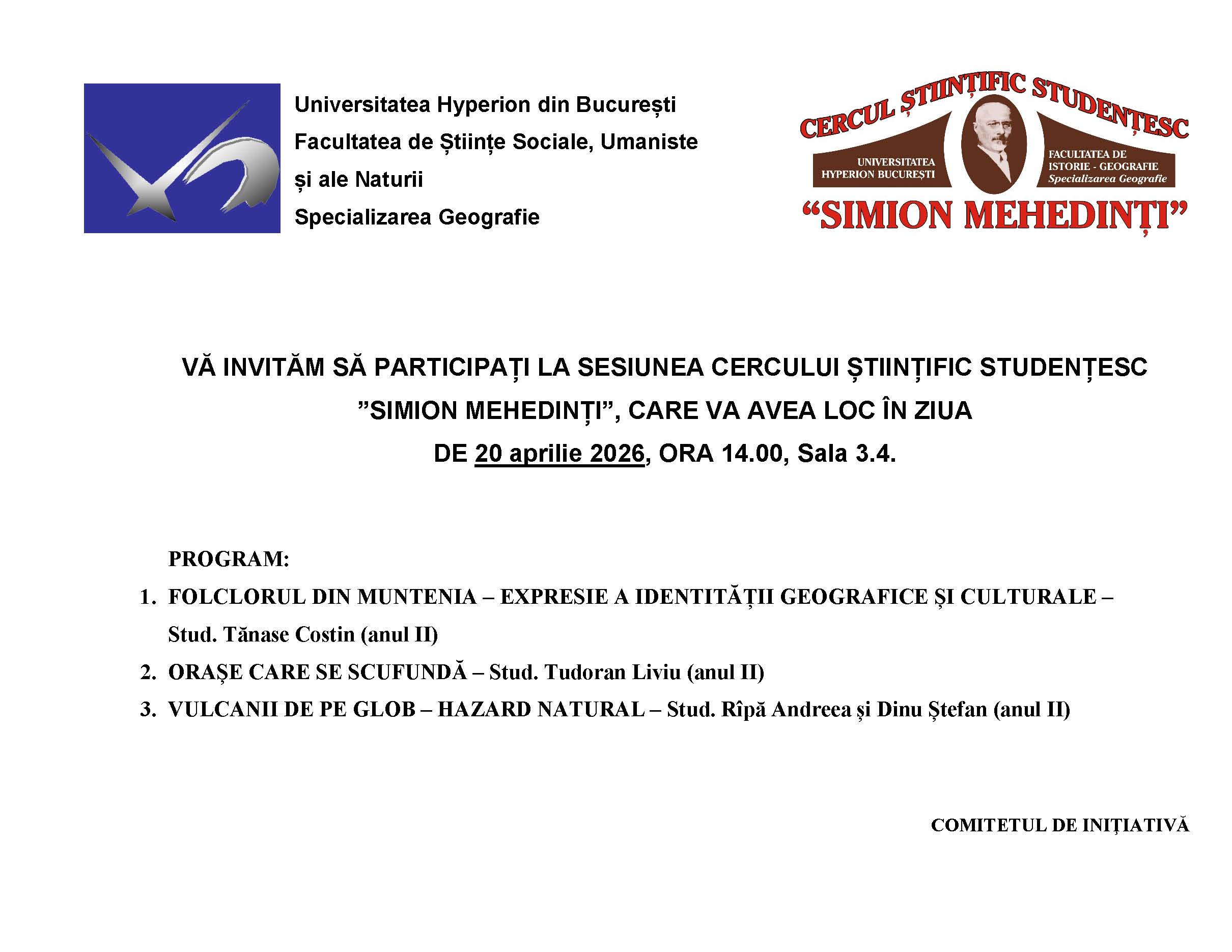 Invitație la SESIUNEA CERCULUI ȘTIINȚIFIC STUDENȚESC ”SIMION MEHEDINȚI” 2026