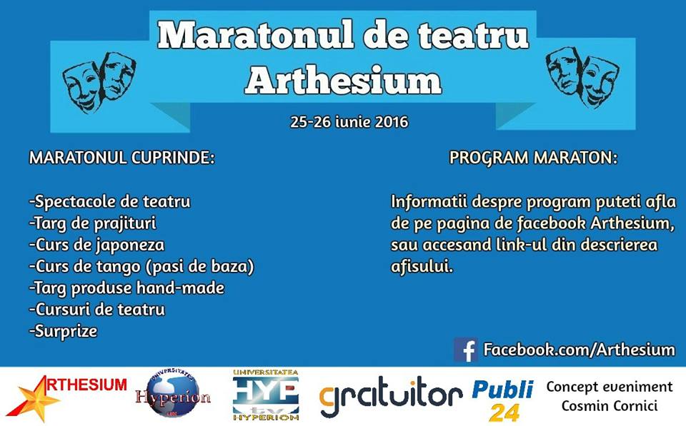 În perioada 25 – 26 iunie, trupa de teatru Arthesium organizează Maratonul de teatru Arthesium. Universiattea Hyperion este partener principal al evenimentului.