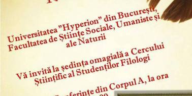 Studenții filologi de la Universitatea Hyperion organizează ședința Cercului științific din luna ianuarie 2015, în ziua de 15, pentru a marca, pe de o parte, evenimentul cultural...