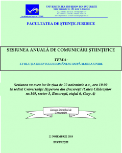 Facultatea de Drept a Universității Hyperion organizează joi, 22 noiembrie, sesiunea de comunicări științifice cu tema „Evoluţia dreptului românesc după Marea Unire”. Aceasta se desfășoară în Sala de conferințe a Universității Hyperion (Calea Călărașilor 169, etaj 6, corp A), începând cu ora 10:00.