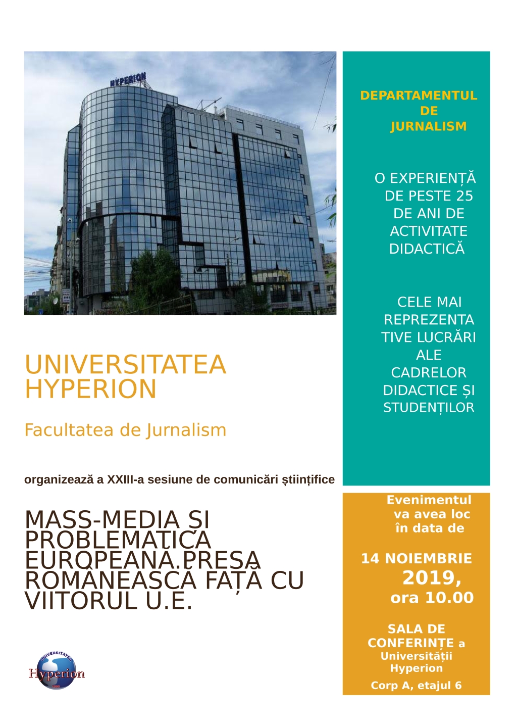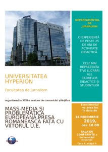 Facultatea de Jurnalism a Universității Hyperion din București organizează cea de-a XXIII-a Sesiune de comunicări științifice cu tema „Mass-media și problematica europeană. Presa românească față cu viitorul U.E.”, o manifestare care își propune să analizeze din diferite perspective modul în care se reflectă valorile europene în mass-media națională, să reflecteze la provocările pe care le aduce cu sine viitorul Uniunii Europene și felul în care România se poziționează față de aceste provocări.