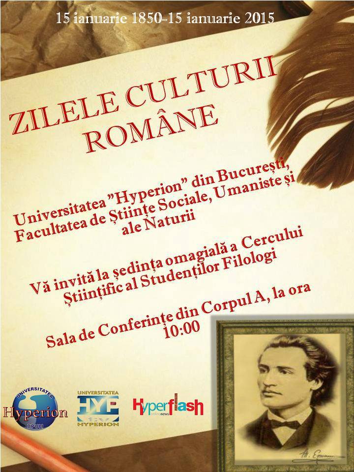 Studenții filologi de la Universitatea Hyperion organizează ședința Cercului științific din luna ianuarie 2015, în ziua de 15, pentru a marca, pe de o parte, evenimentul cultural național și, pe de altă parte, pentru a-l sărbători pe omul deplin al culturii românești. Evenimentul are loc joi, ora 10:00, în sala de conferințe a Universității Hyperion (Corp A, etaj 6).